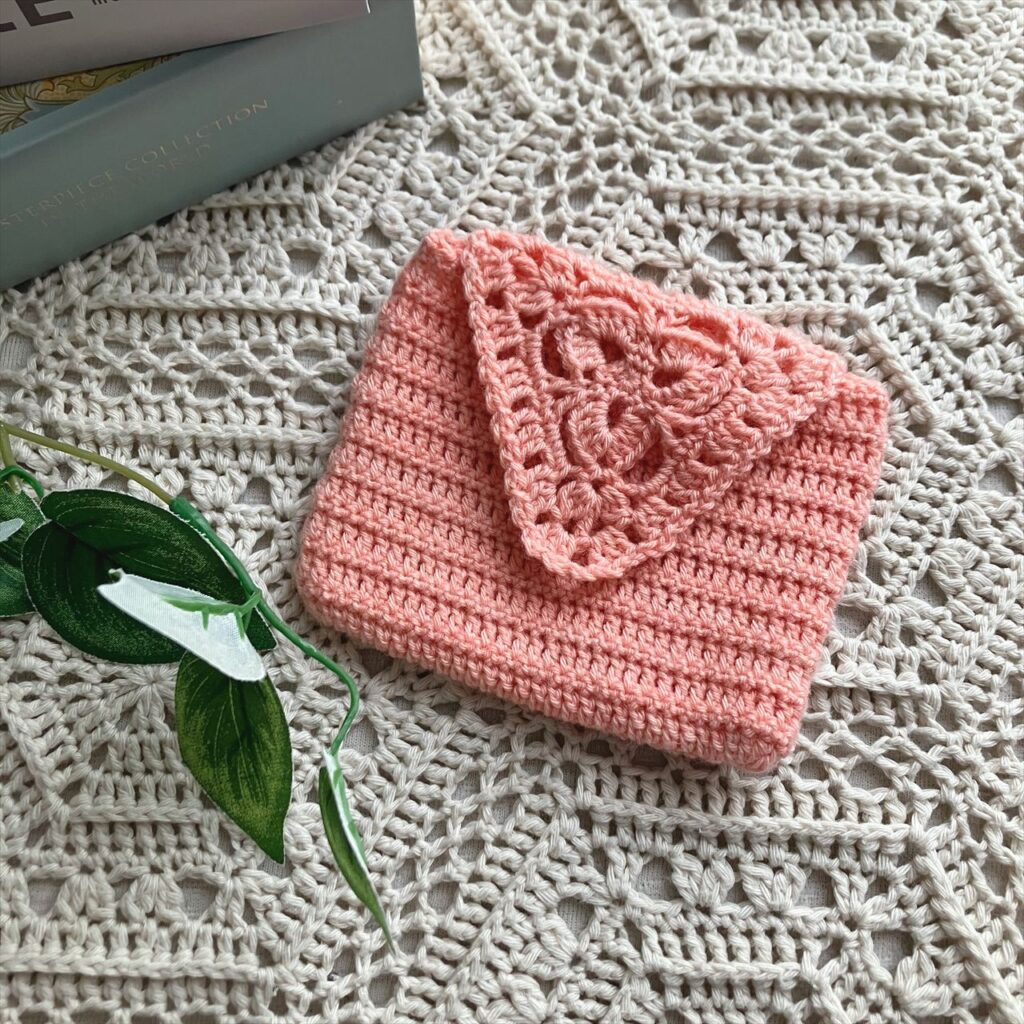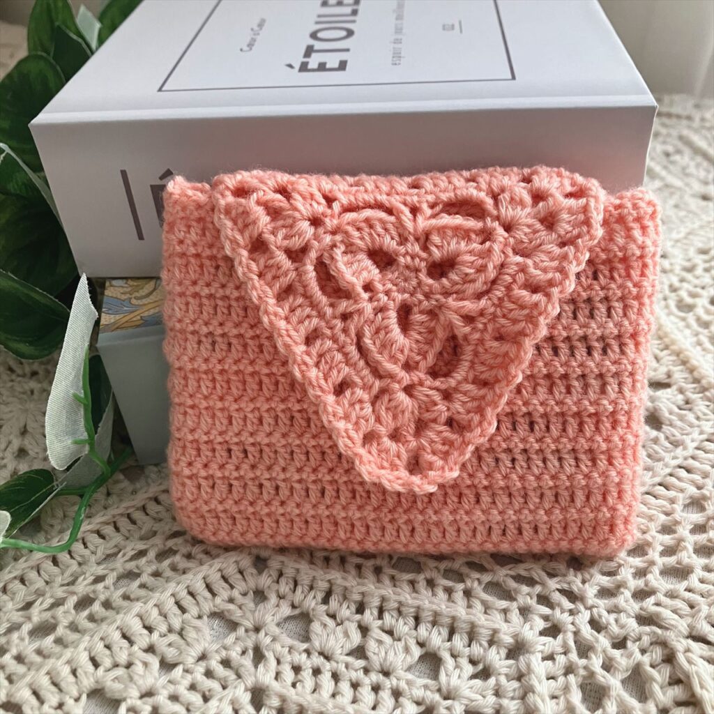 草木染めの杏色で、三角のモチーフがまるで封筒を連想される小さなポーチを編みました。