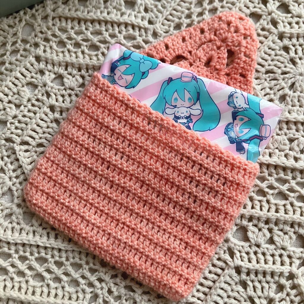 ポケットティッシュが入るサイズで、ポーチ部分は密に編んでいるので、小物も入れられます。