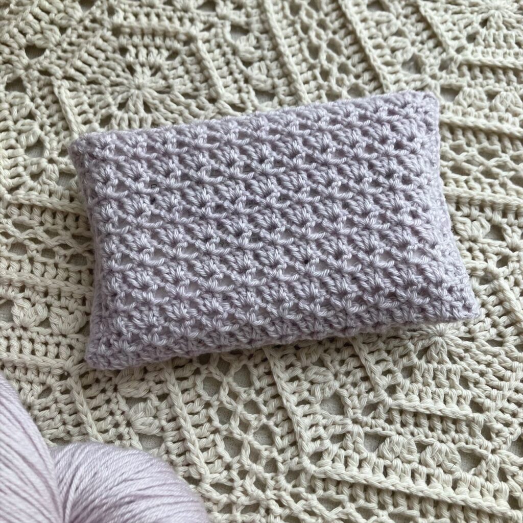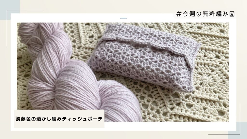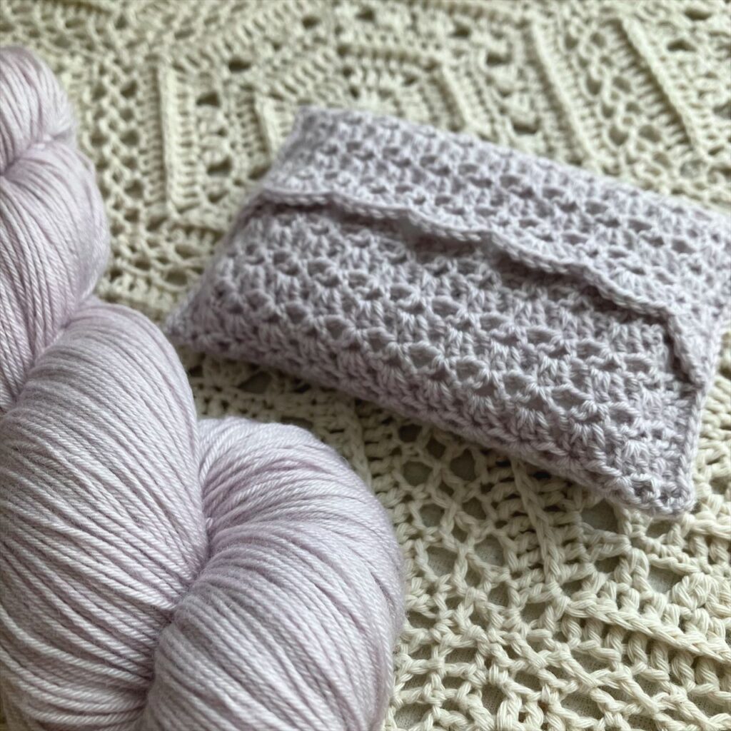 以前編んだポケットティッシュケースを、しっとりとした上品な淡藤色の草木染め糸で編み直しました。