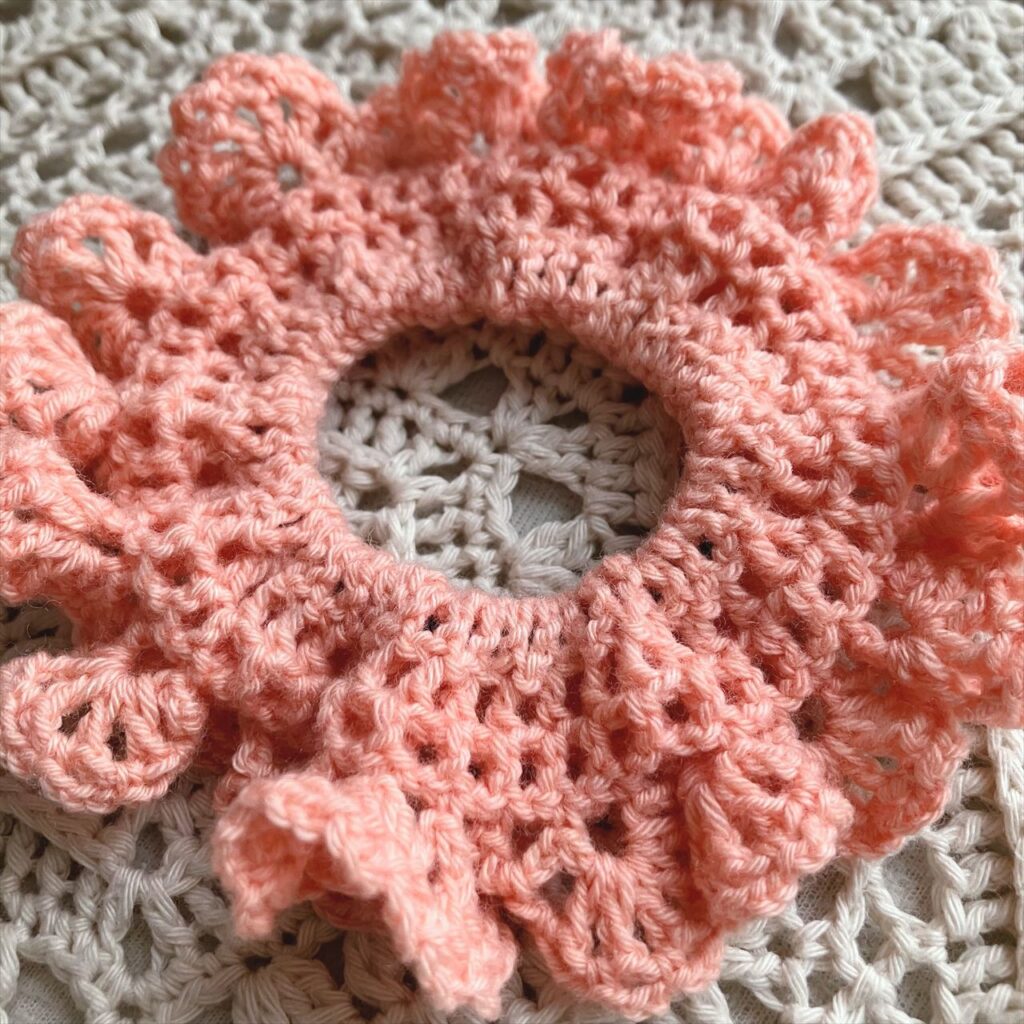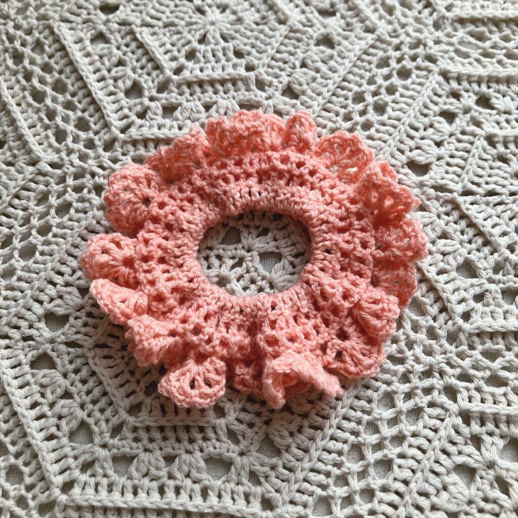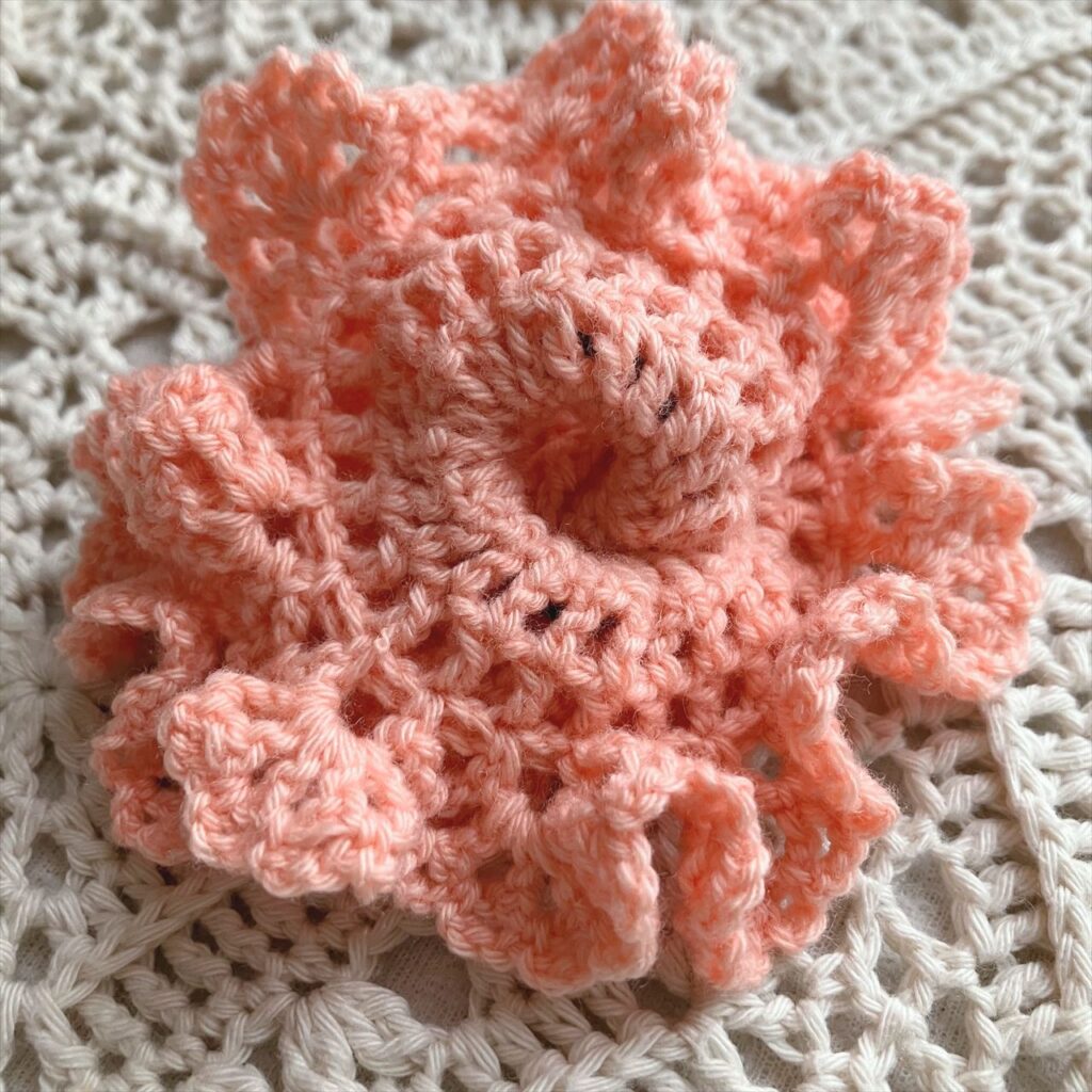 花びらみたいなフリルが軽やかなシュシュを編みました!