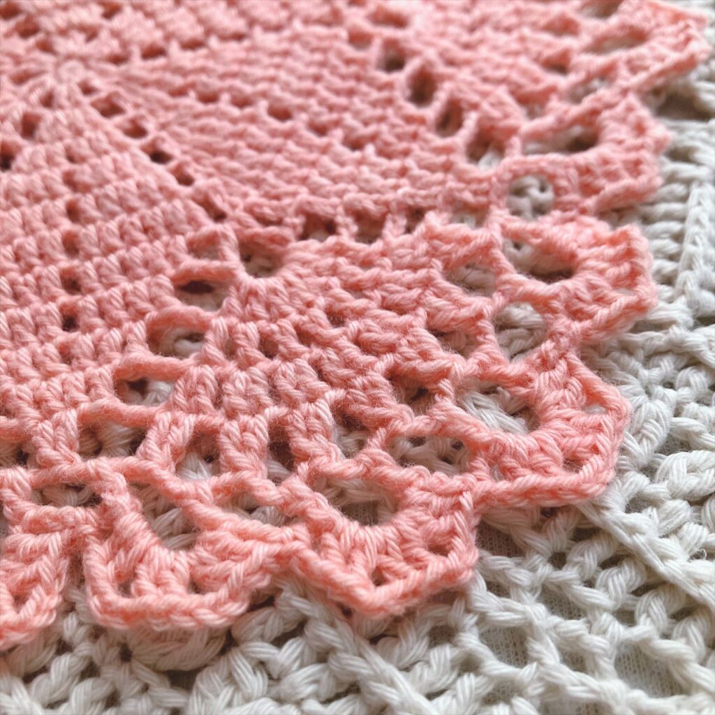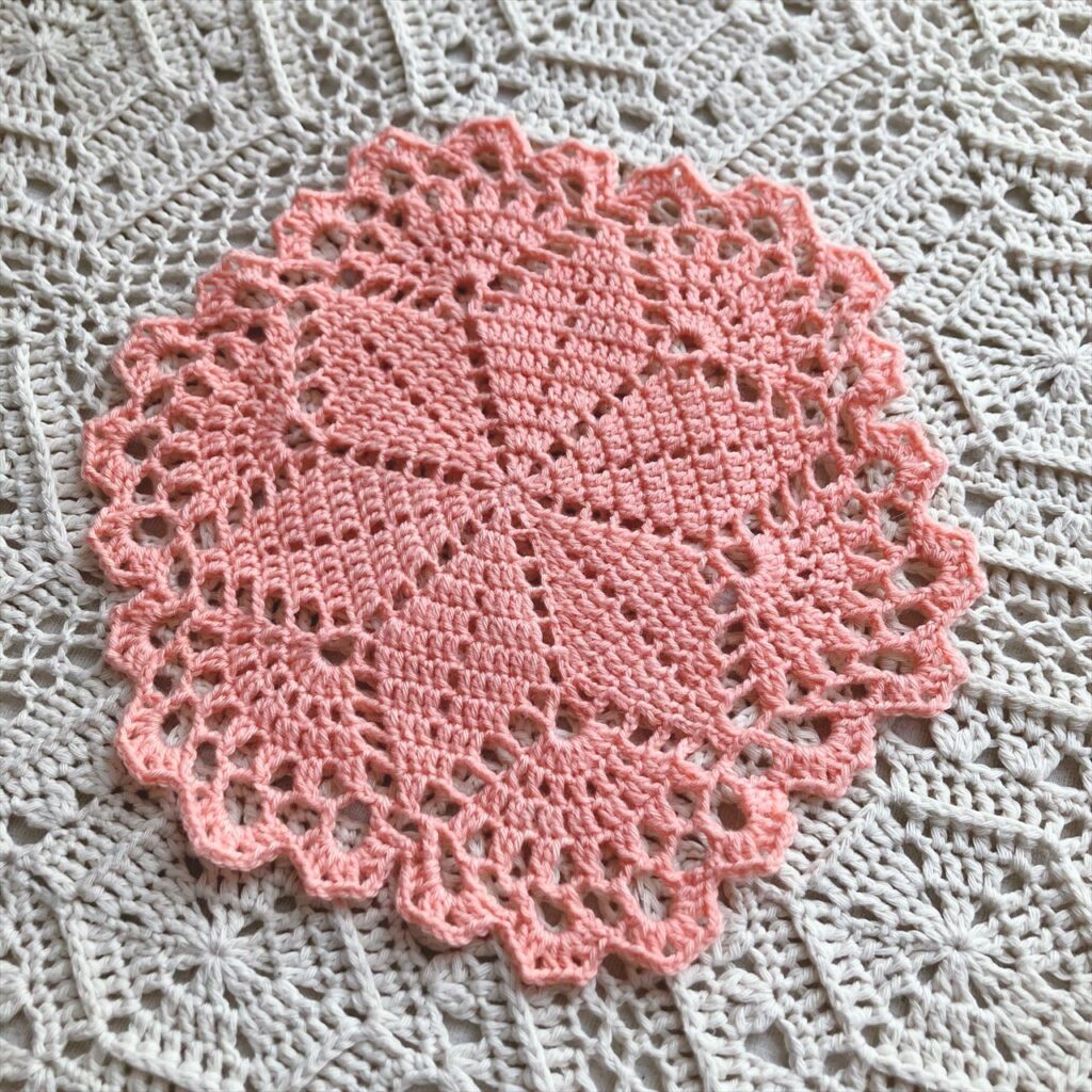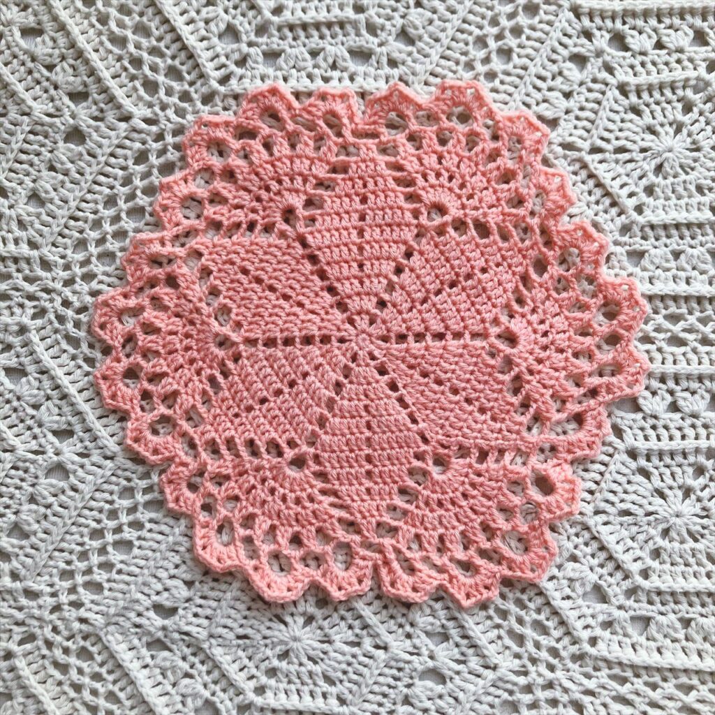 大輪の花のようにも見える中心の模様と、後半の葉っぱ模様の対比がとても楽しいドイリーです。
