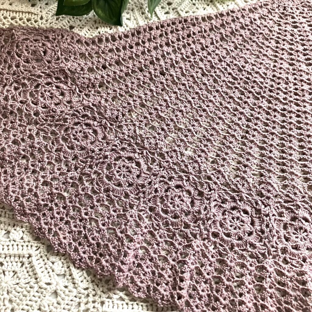 台形モチーフを横一列に繋いで、上辺と下辺からそれぞれ目を拾って半円型のストールに仕上げました。