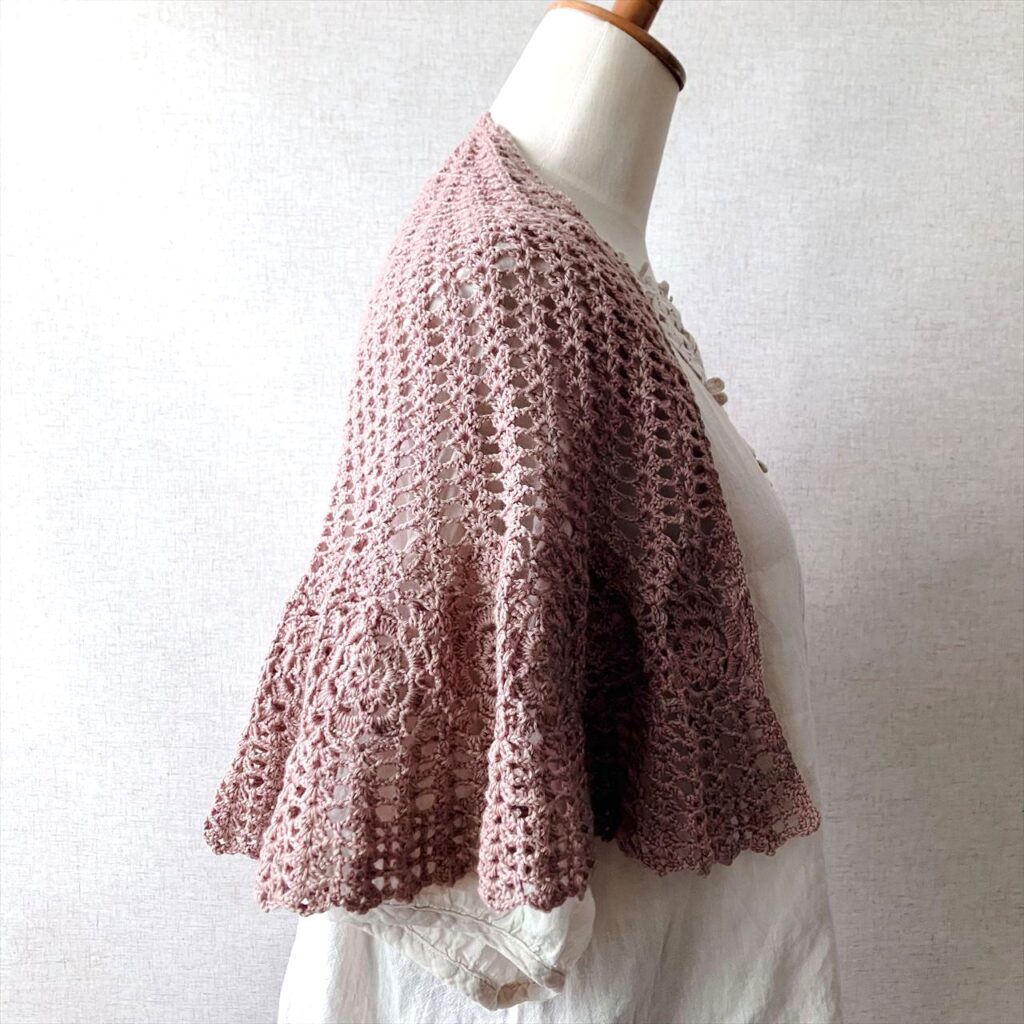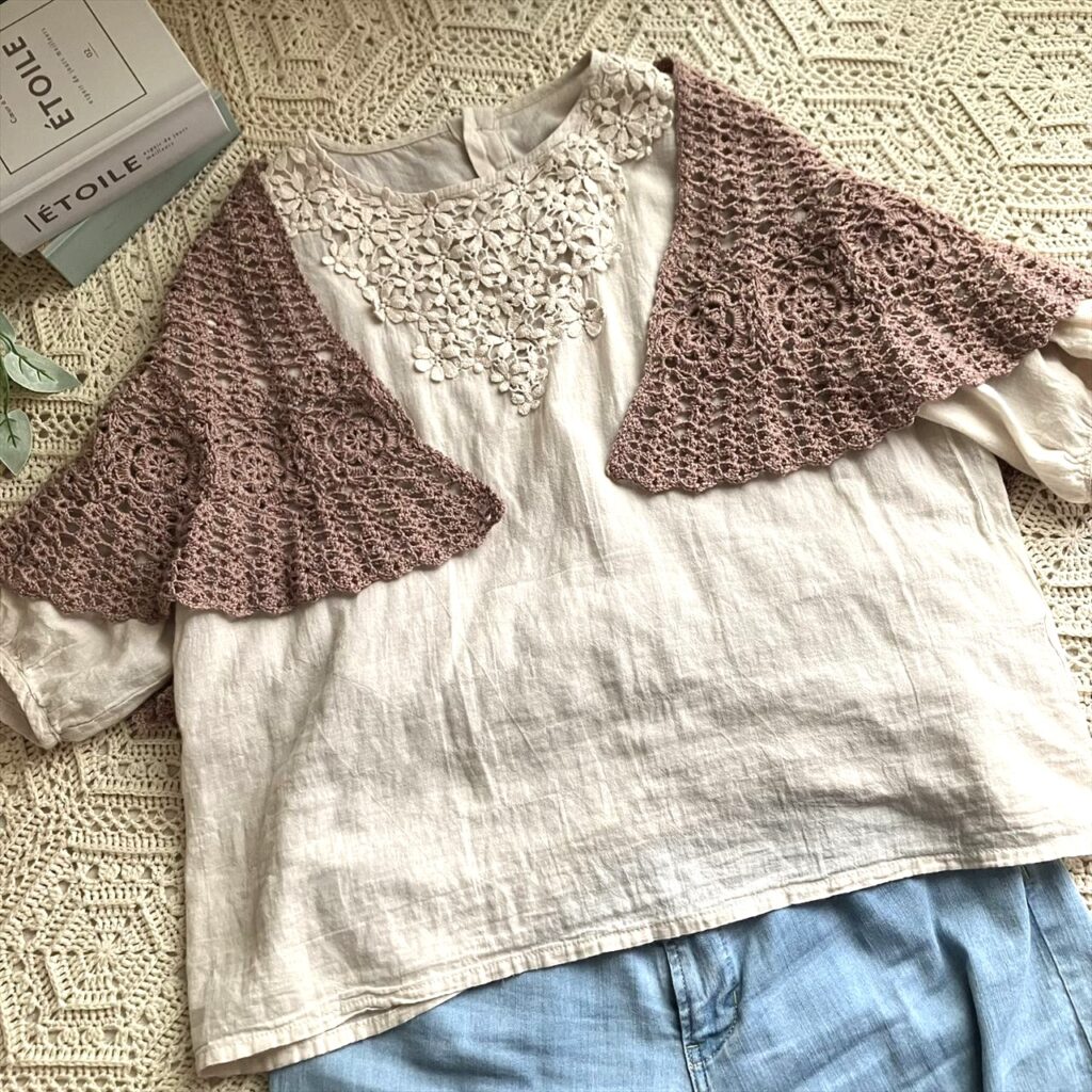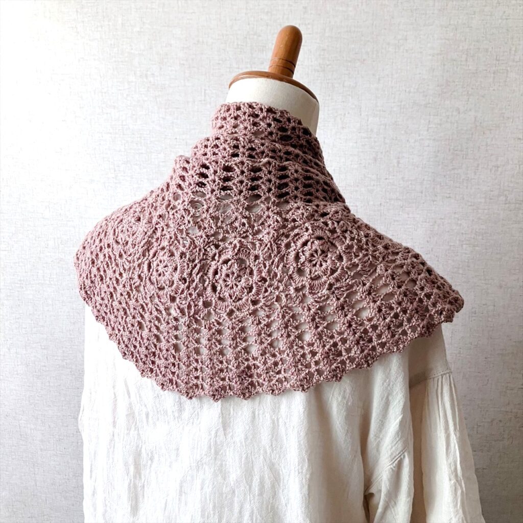 ふんわりと羽織る他、付け襟風に首元でクシュっとして前で軽く結んでも、半円なので肩にしっとりと沿って、モチーフ部分が綺麗に見えてくれます。