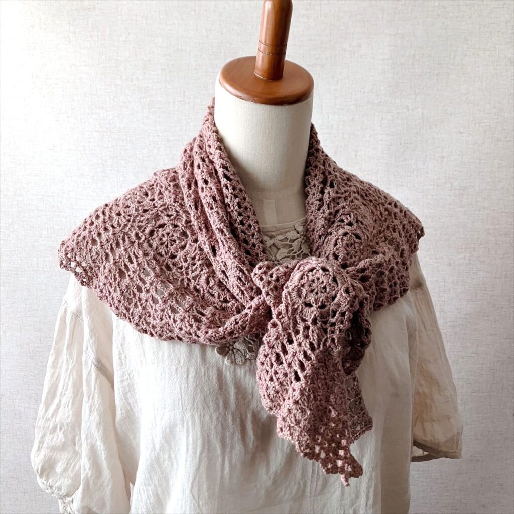 モチーフを編み繋いで上下に向かって編んでいくので、最初から最後まで同じ模様を繰り返すようなストールに比べると少し難しいかもしれませんが、使っている編み方自体は難しくないので、初級~の方でも楽しんで編んでいただけるのではないかなと思います。