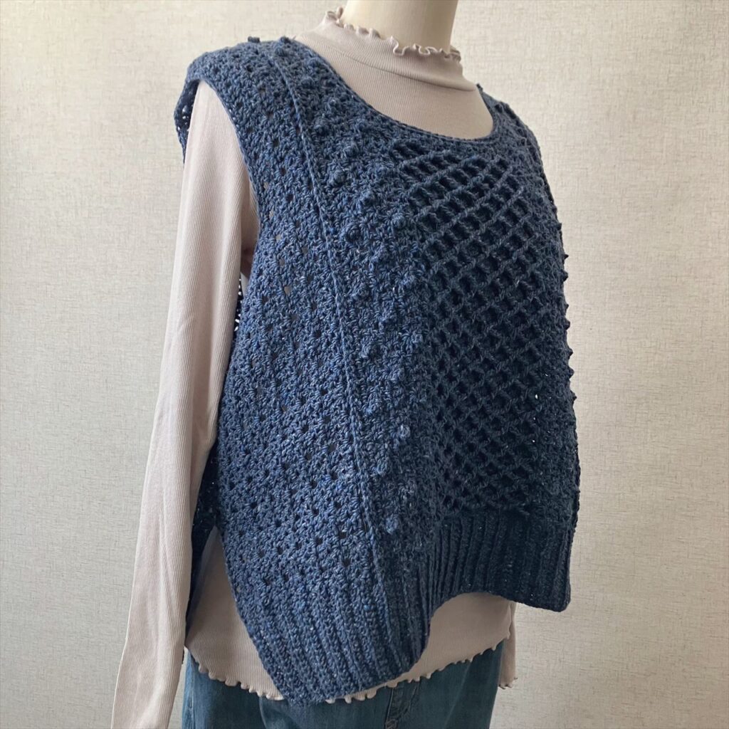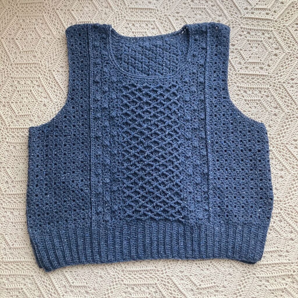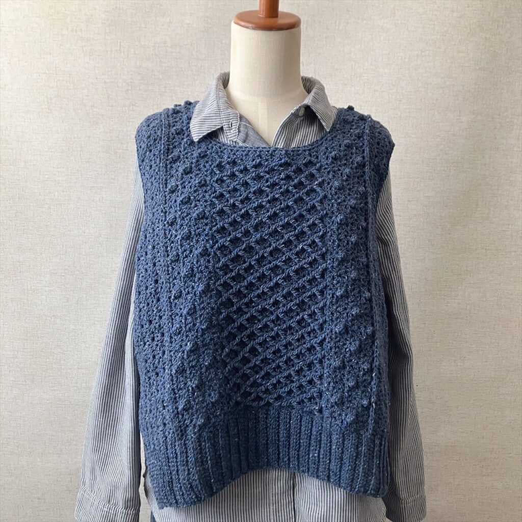 かぎ針編みだけで編むアラン模様のベストは、地模様とボッブルみたいなパプコーン編みの編地、棒針のハニカム模様を模した小さめダイヤ柄の3種類の編地で編みました。