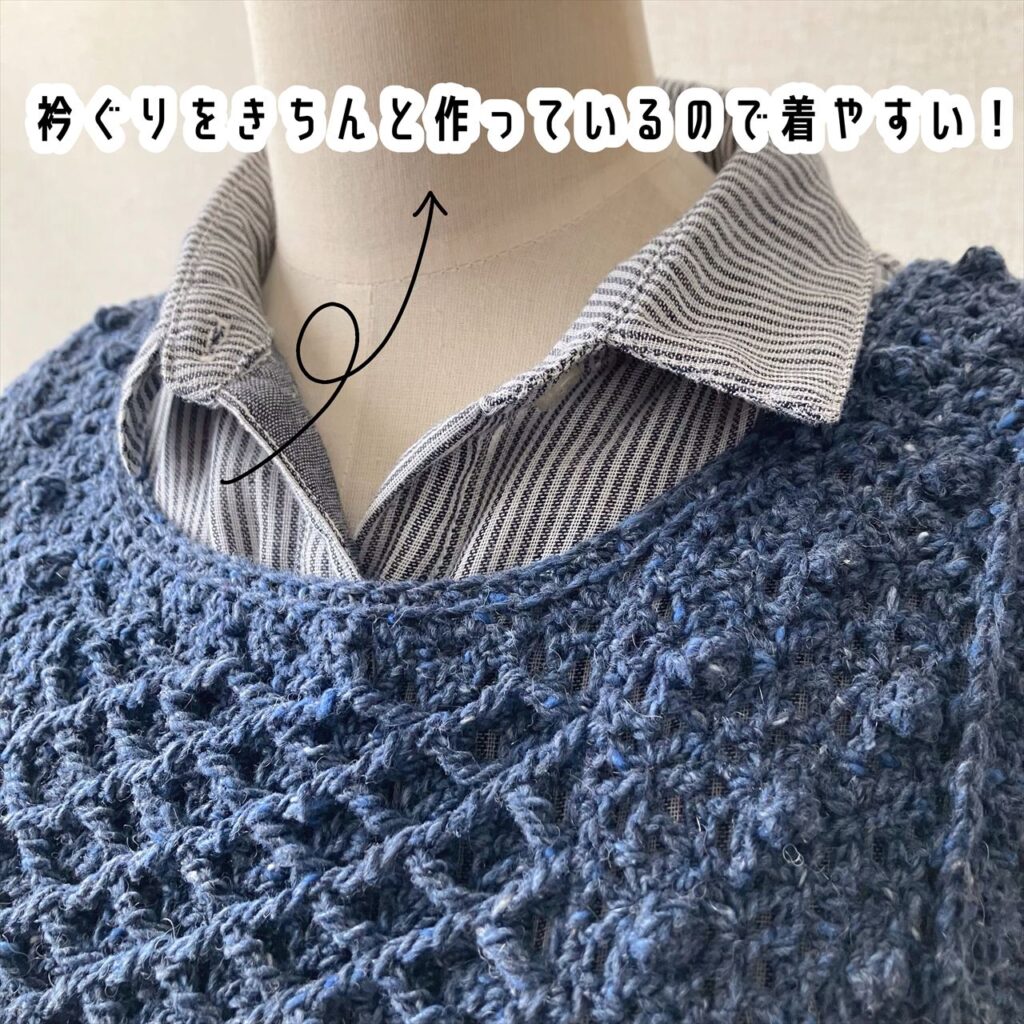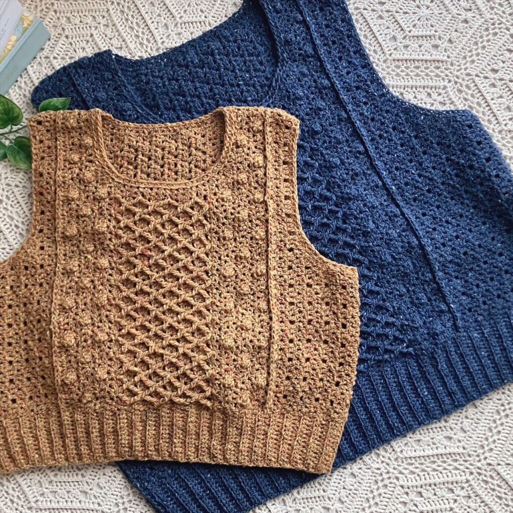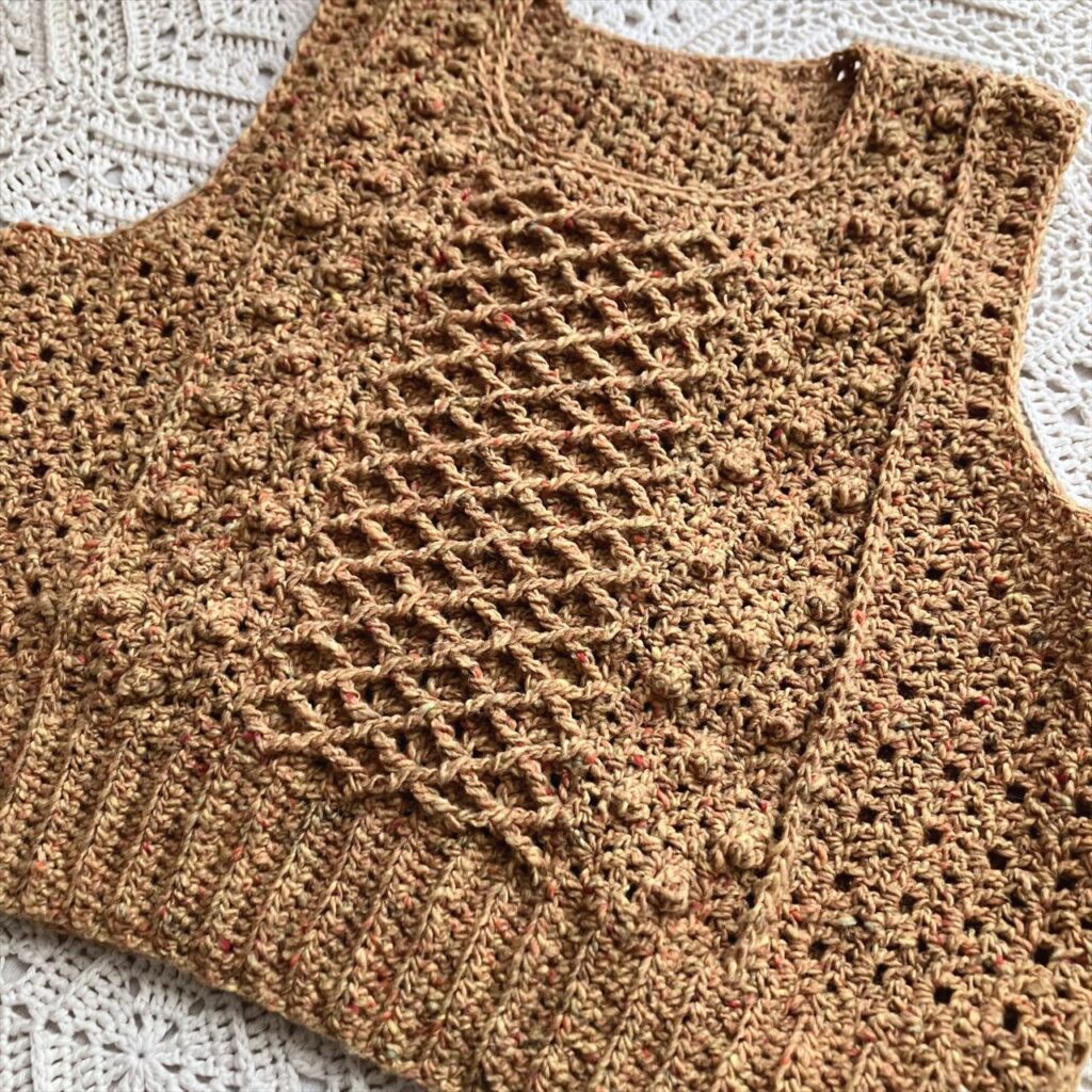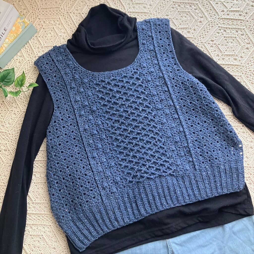 かぎ針編みだけで編むアラン模様のベストは、地模様とボッブルみたいなパプコーン編みの編地、棒針のハニカム模様を模した小さめダイヤ柄の3種類の編地で編みました。