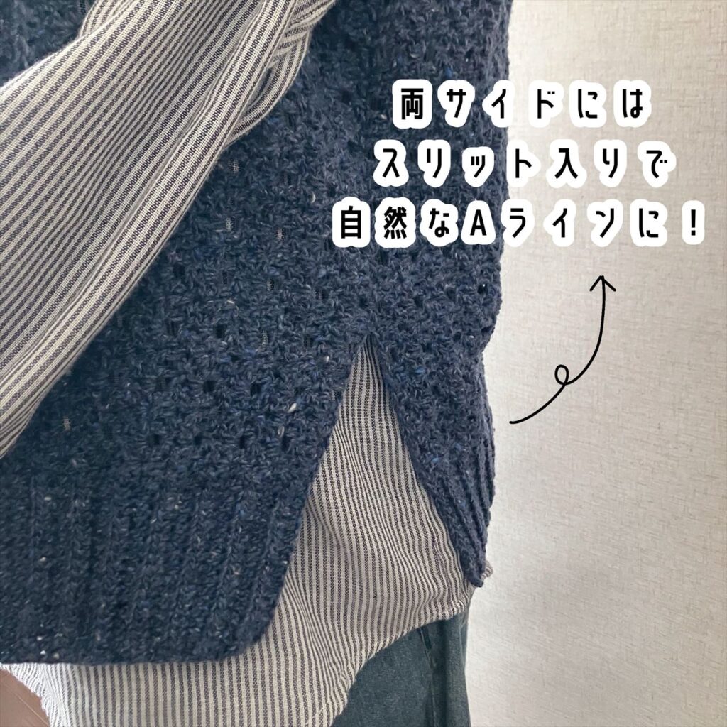 シャツやブラウスと合わせたり、タートルネックやハイネックのカットソーと合わせたりと、オーソドックスなアラン模様のベストなので、合わせるものを選ばず、いろいろな重ね着が楽しめます。