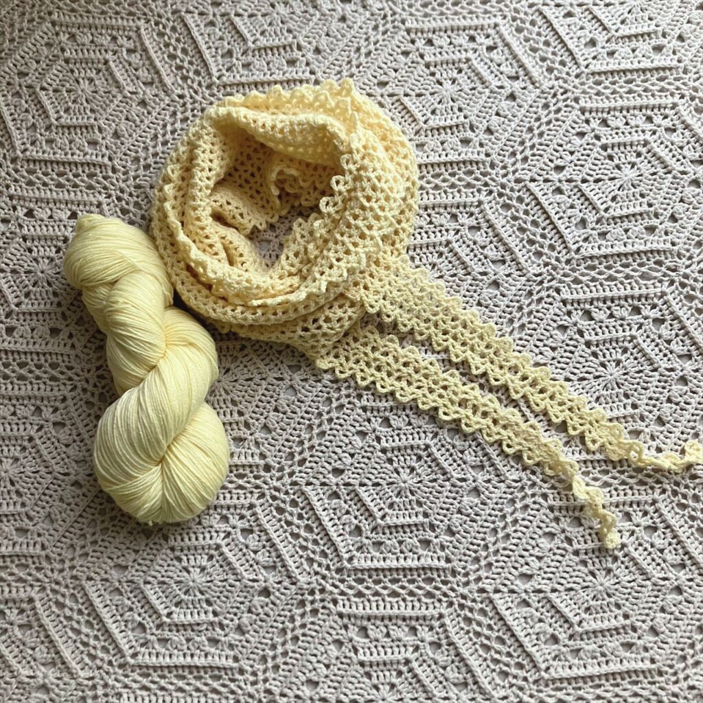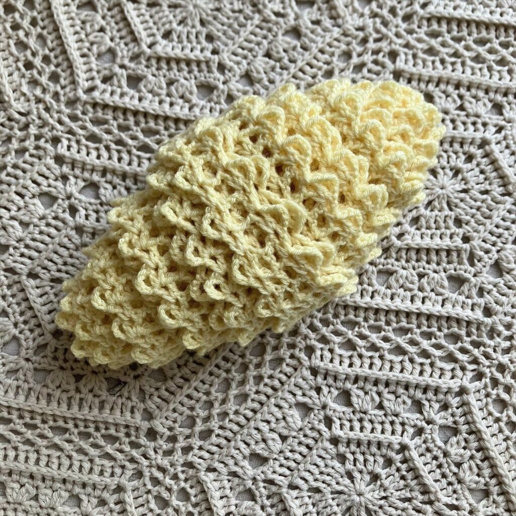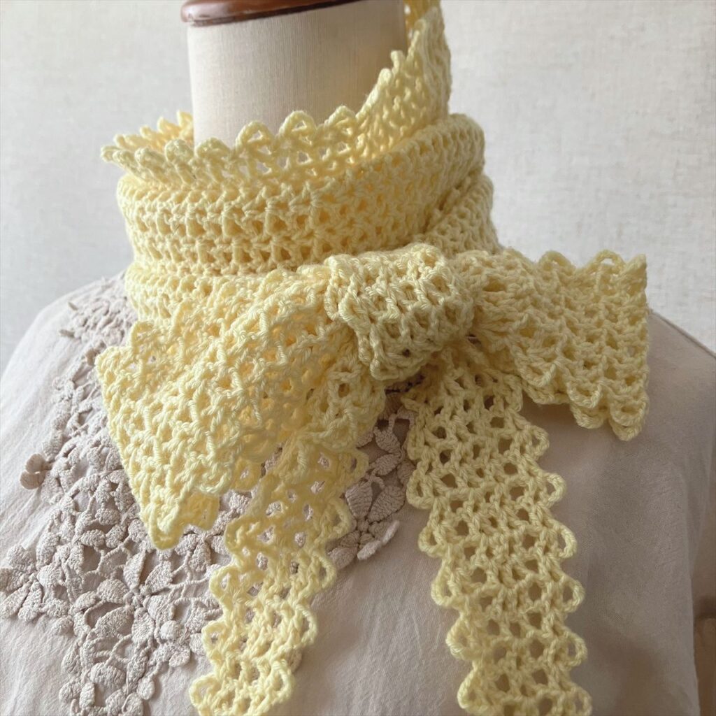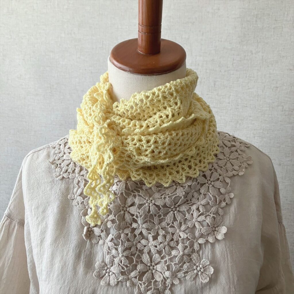 最近SNSでよく見かけるくるくる丸めるとクロワッサンのようになるストールが編みたくて、春先まで使えるような感じで編んでみました。