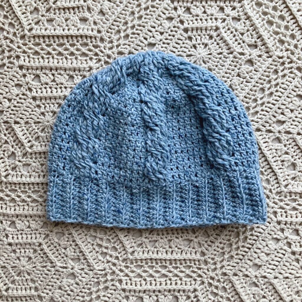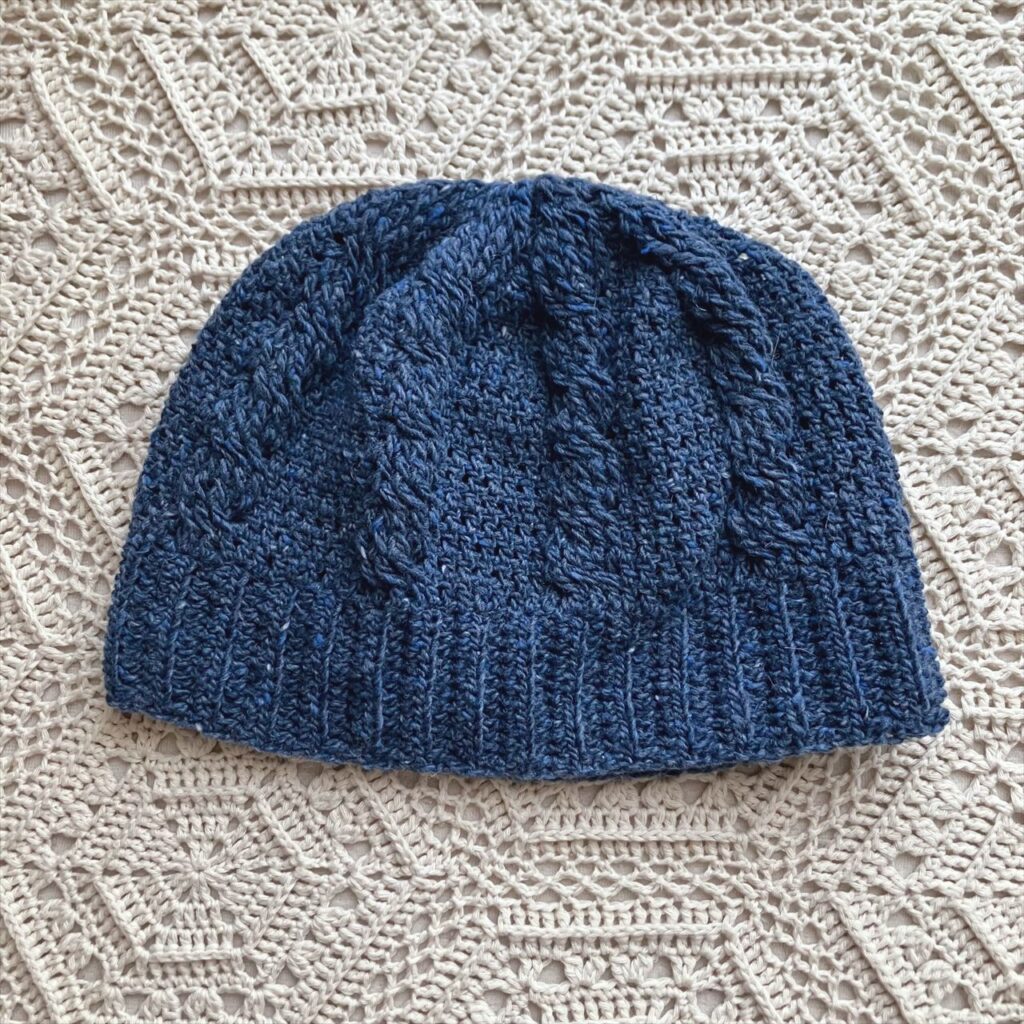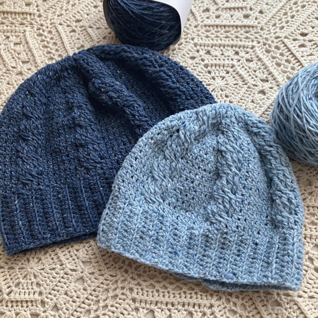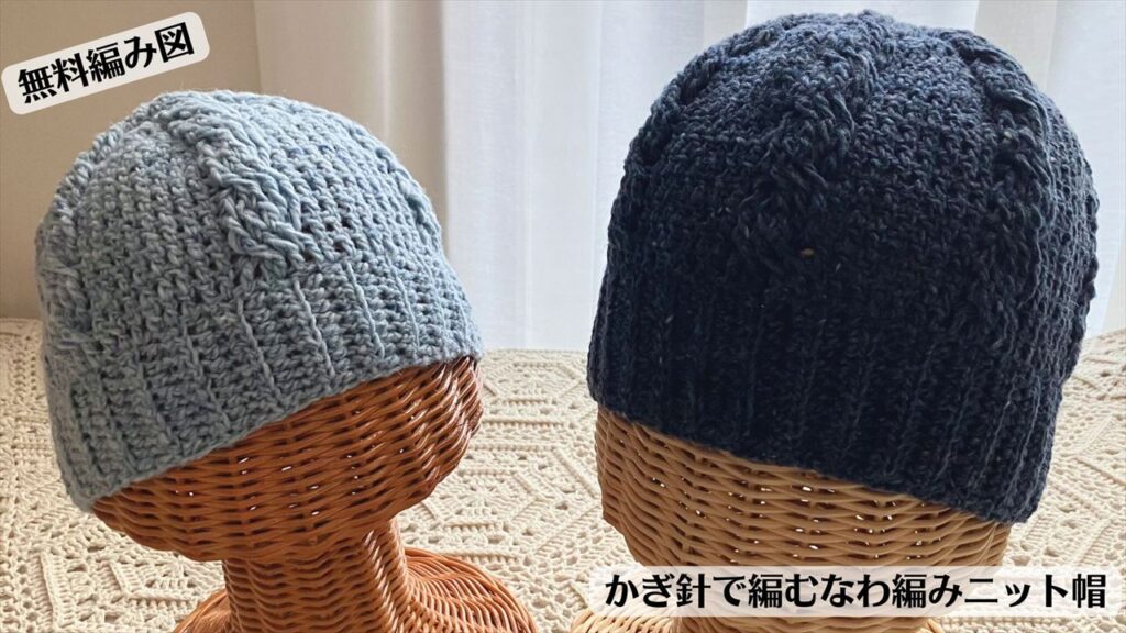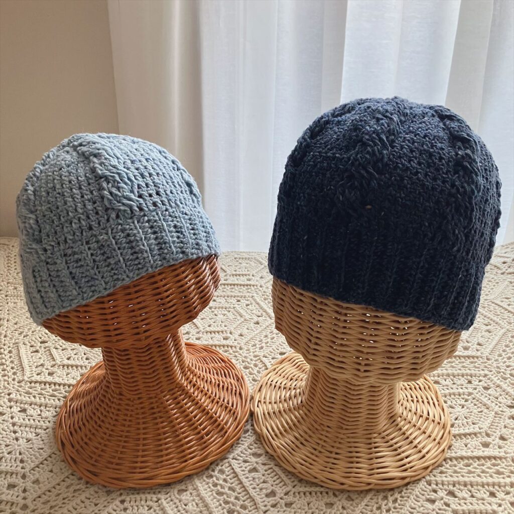 以前編んだ、かぎ針編みで編むシンプルな縄編みのニット帽を、別の糸で編み直しました!
